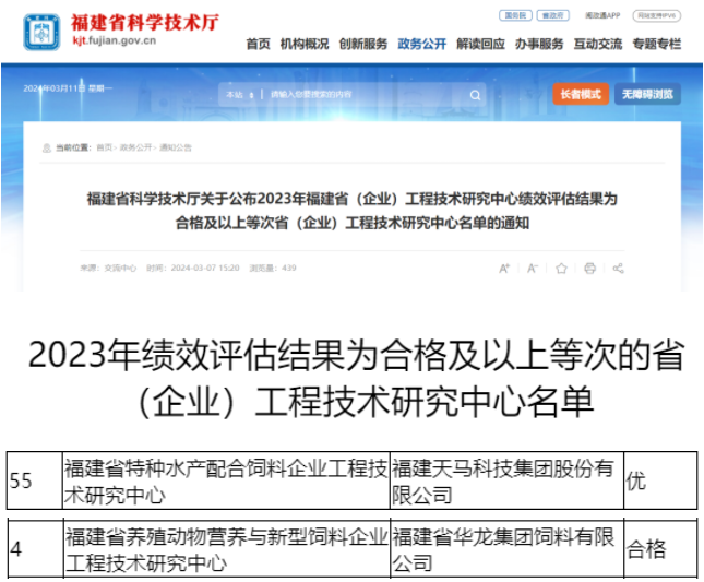 天馬科技訊 近日,福建省科學技術廳組織完成了福建省(企業(yè))工程技術研究中心績效評估工作。其中包含天馬科技集團下屬的兩大研究中心:福建省特種水產配合飼料企業(yè)工程技術研究中心、華龍集團的福建省養(yǎng)殖動物營養(yǎng)與新型飼料企業(yè)工程技術研究中心。